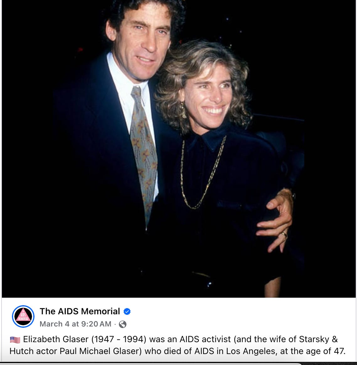 Fast forward to the late 80’s, Starsky & Hutch’s Paul Glaser and wife Elizabeth Glaser’s story made frontpage news across the country. Rather than allow the Inquirer to out her,she did.